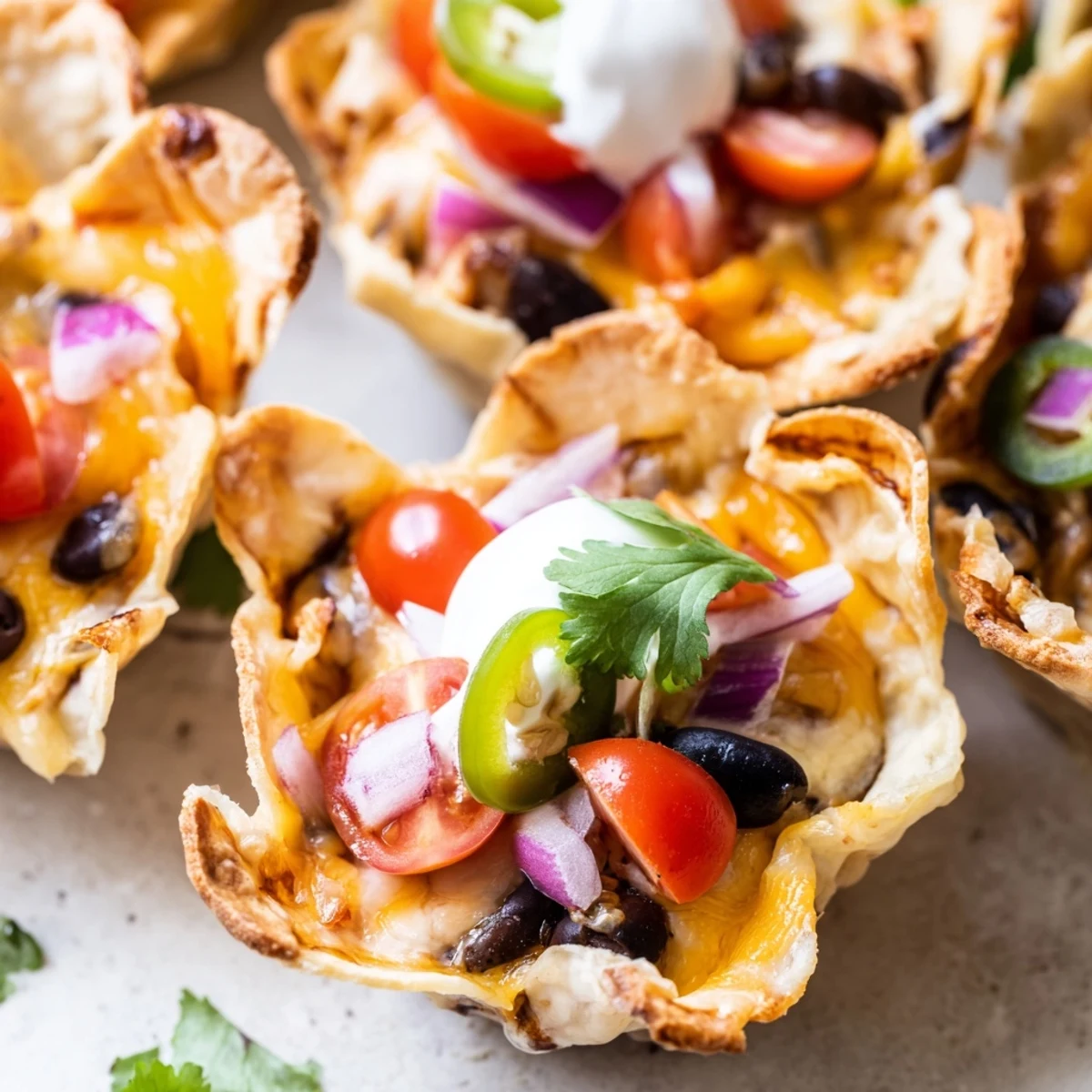 You can prepare all the toppings in advance and store them separately in the refrigerator. Assemble and bake just before serving for the crispiest texture. Leftovers can be stored in the fridge for up to 2 days, though the tortilla cups may soften slightly.