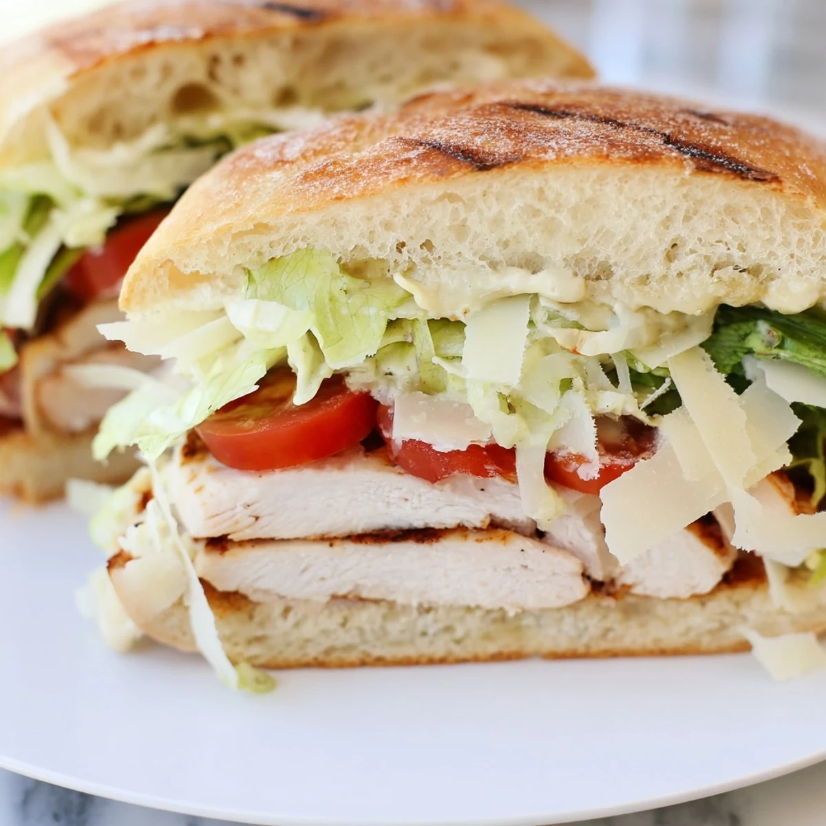 This hearty handheld combines tender grilled chicken breasts seasoned with garlic and pepper, layered with crisp shredded romaine and tangy homemade Caesar dressing. Served on golden toasted ciabatta rolls with shaved Parmesan, it delivers all the classic flavors you love in a portable format perfect for lunch or dinner.