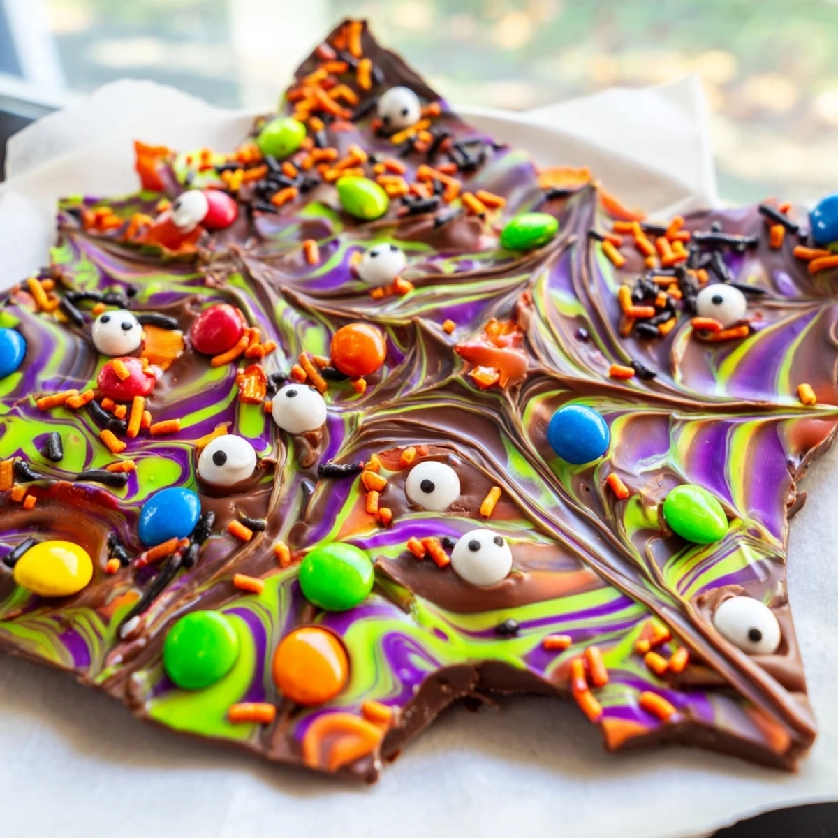 This festive Halloween treat features melted semisweet chocolate swirled with white chocolate and colorful candy melts, creating a spooky marbled effect. Top with candy-coated chocolates, googly eyes, and Halloween sprinkles for maximum fun. The entire treat comes together in just 20 minutes and breaks into perfect shareable pieces.